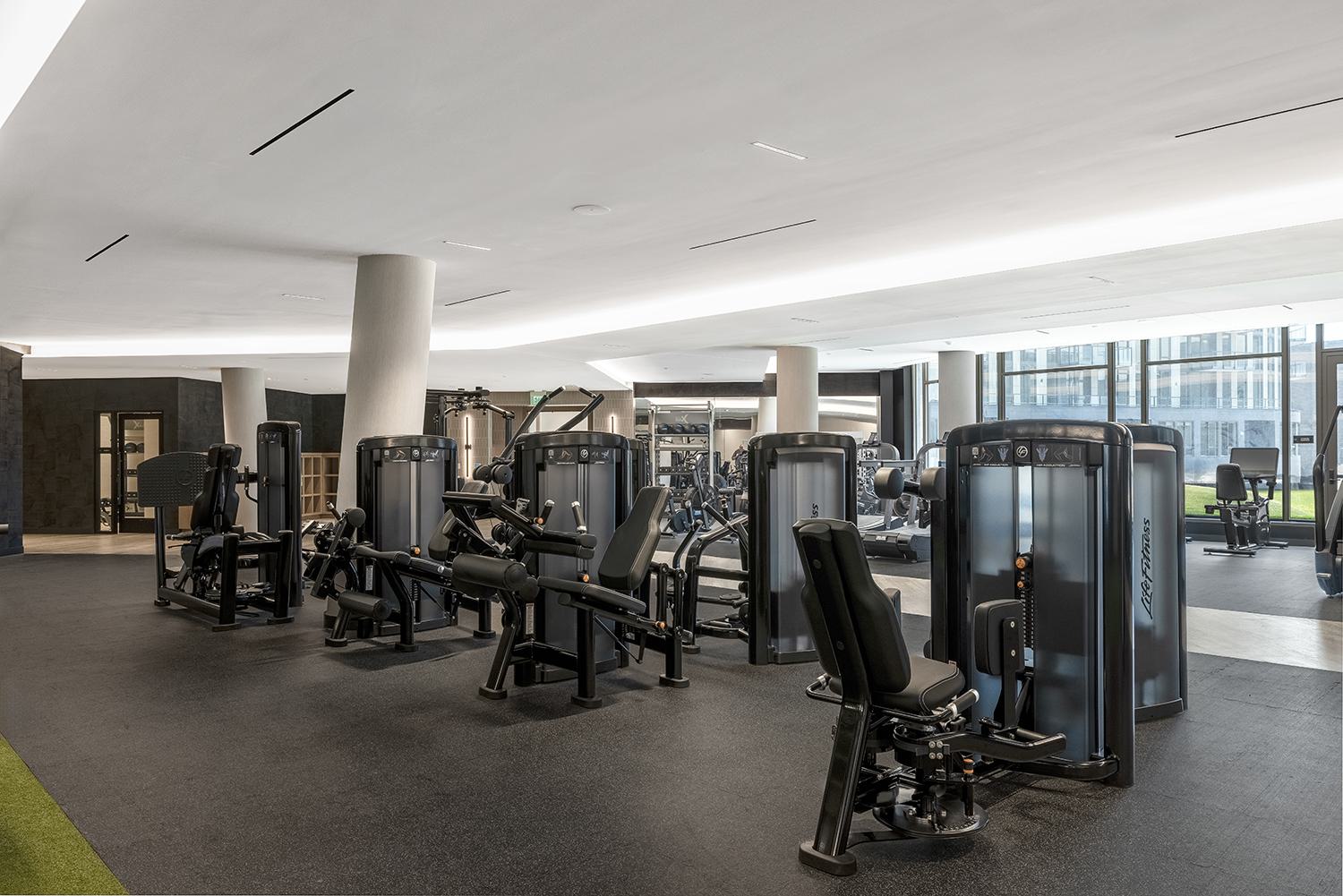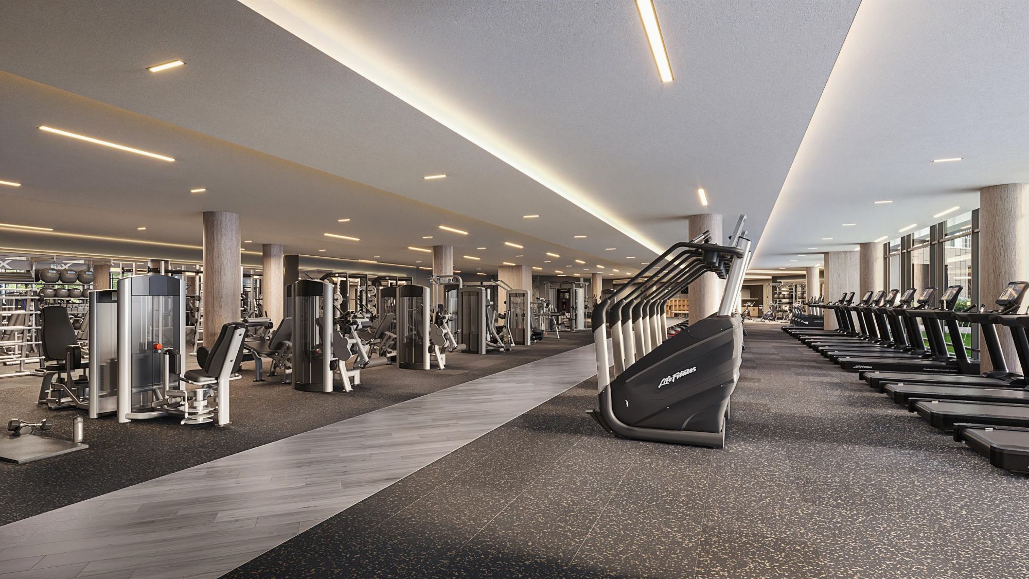 State-of-the-art fitness center with cardio, strength training, free weights, modern lighting, and courtyard views