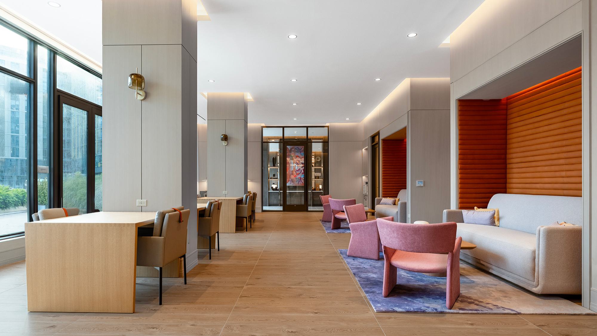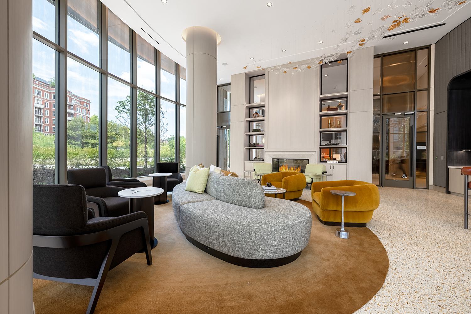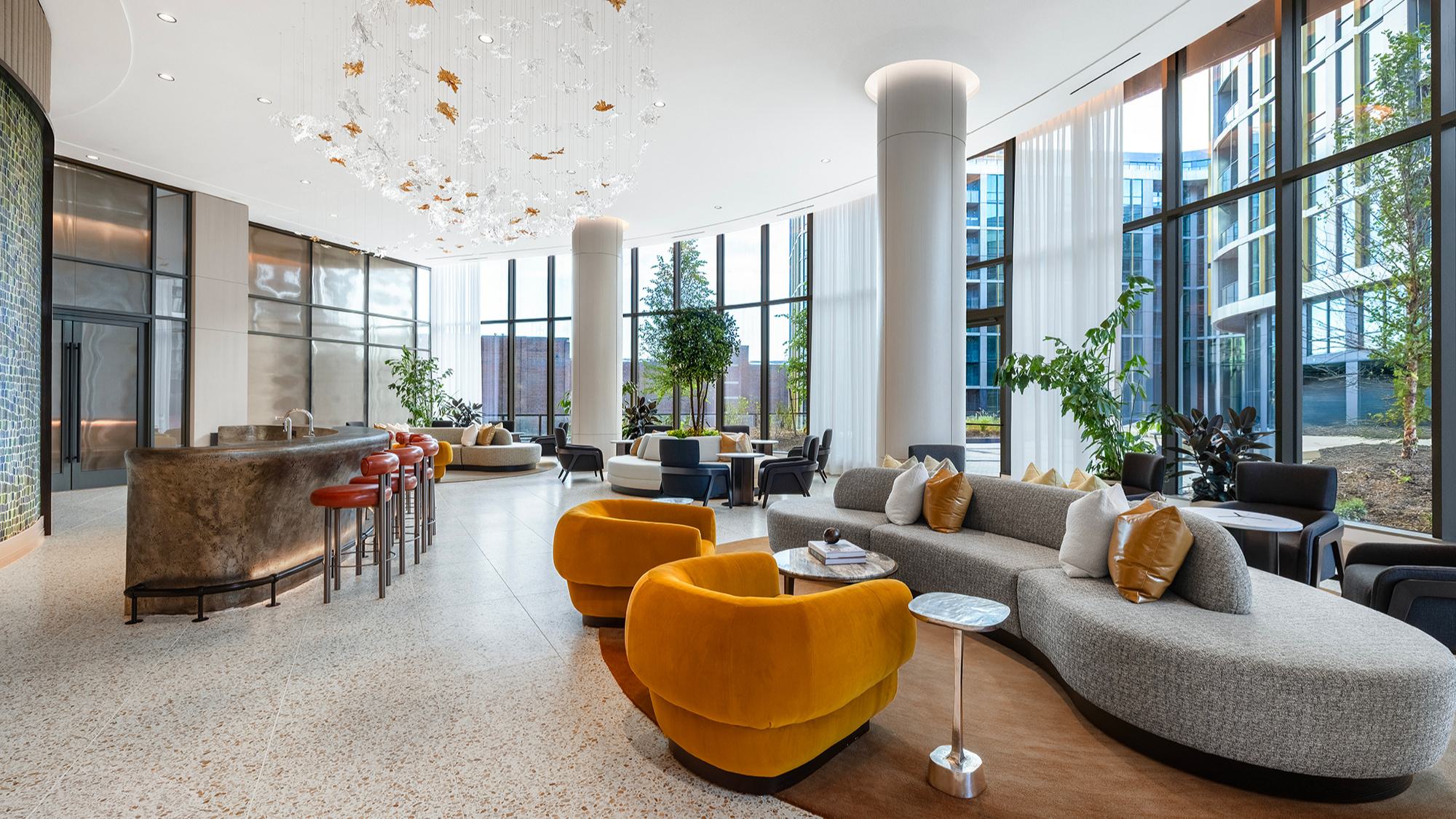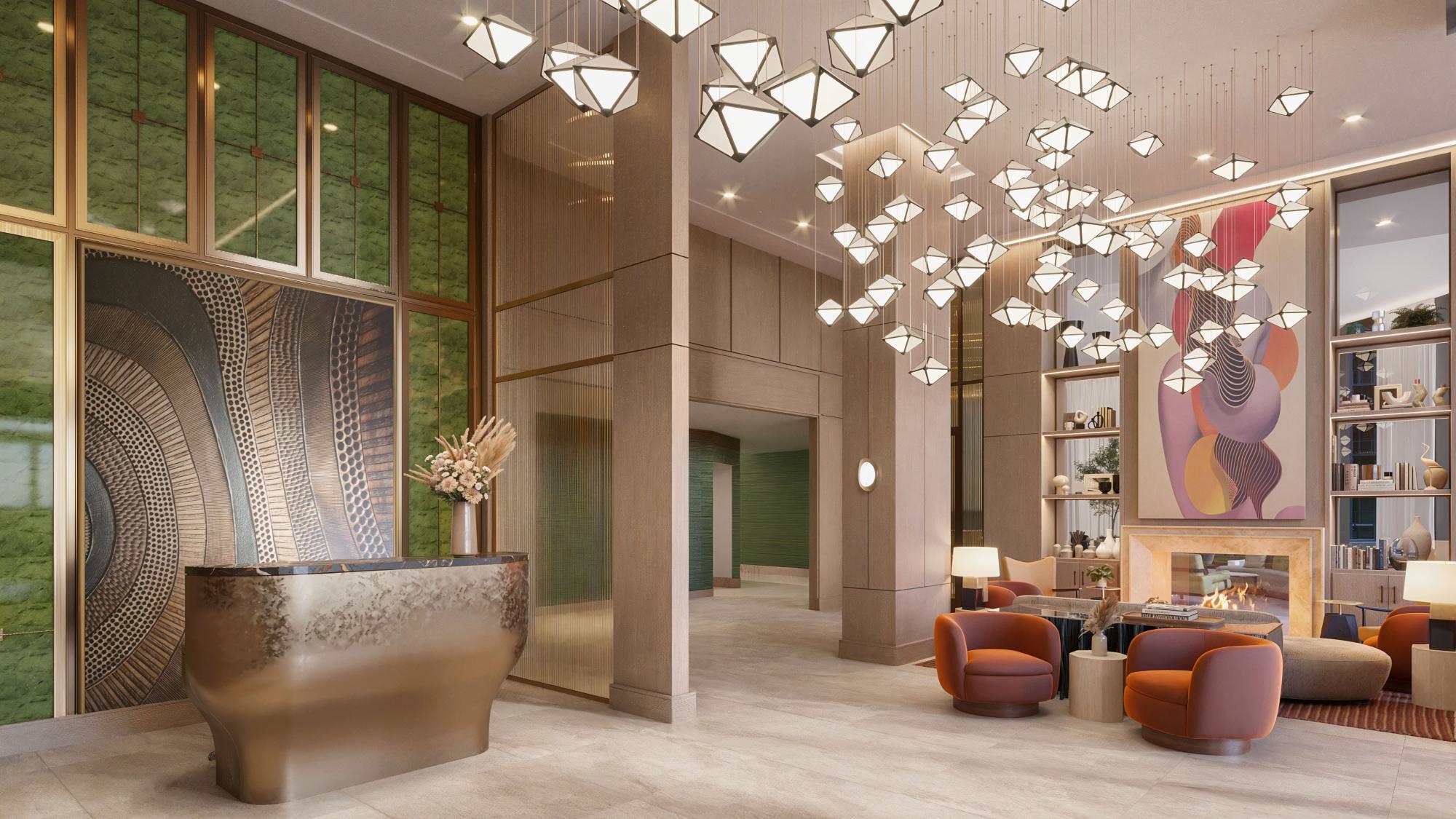 Expansive building lobby with geometric pendant lighting, sculptural front desk, stylish seating area, and bold artwork