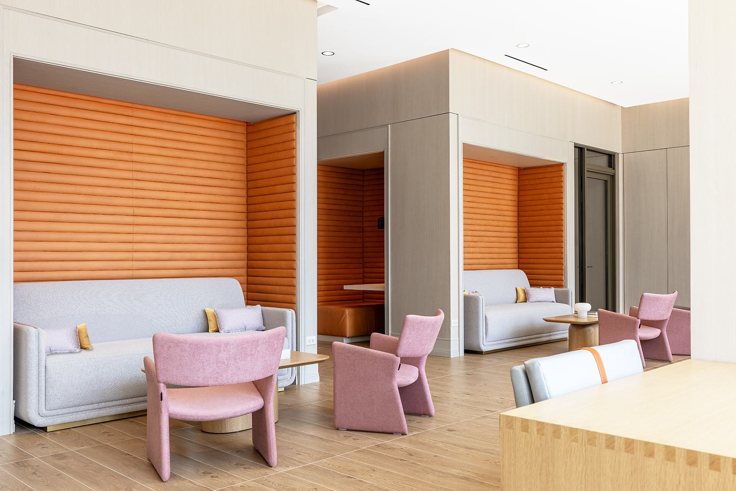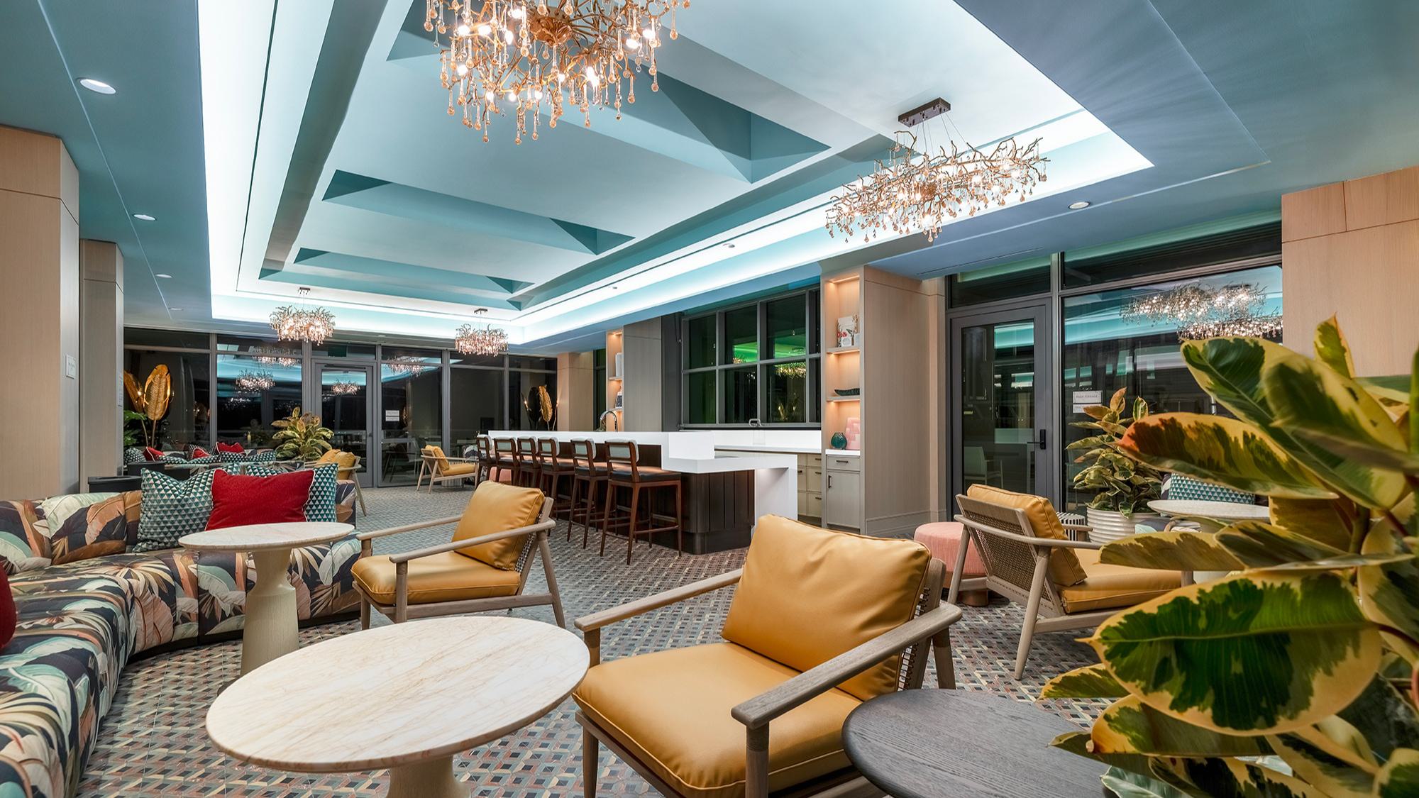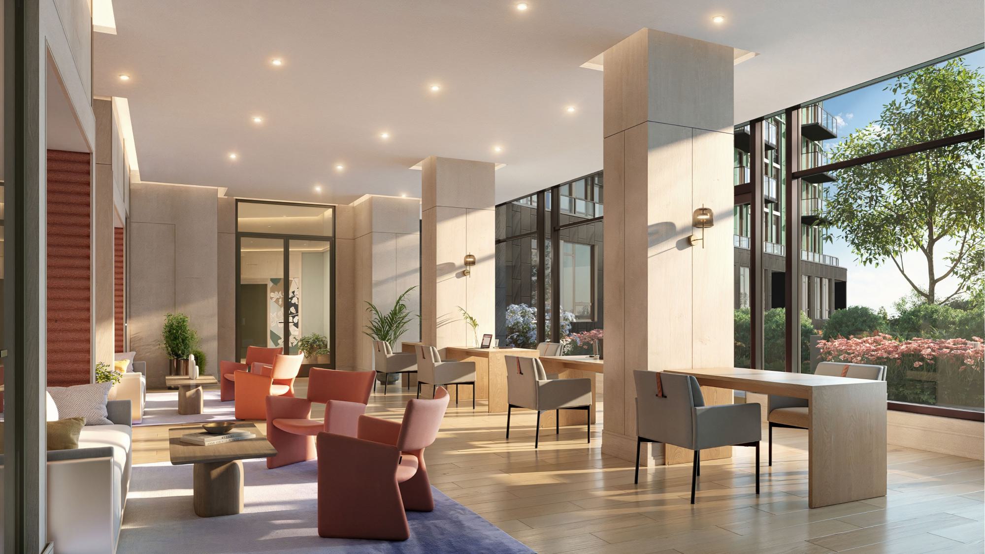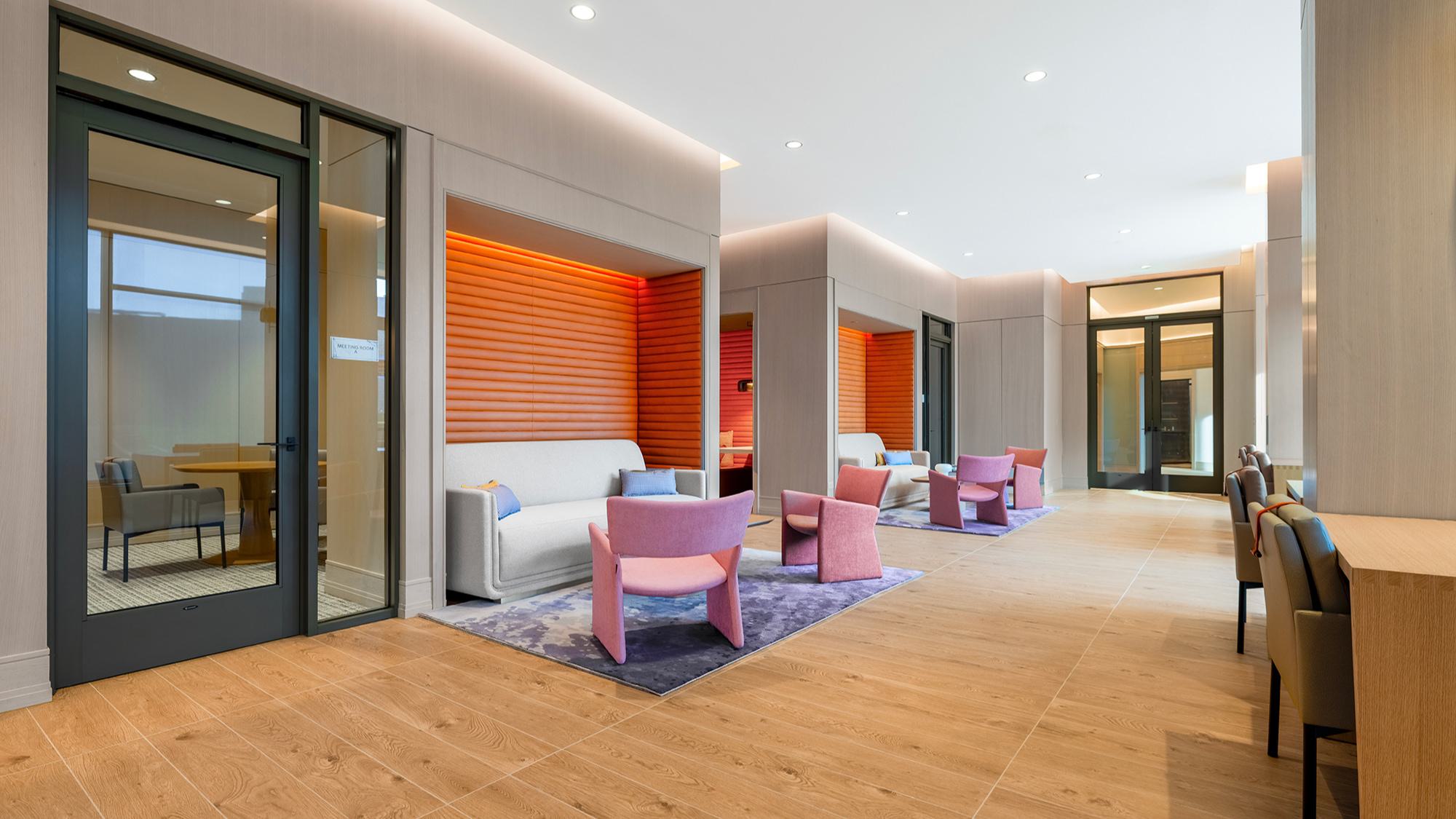 Expansive building lobby with geometric pendant lighting, sculptural front desk, stylish seating area, and bold artwork