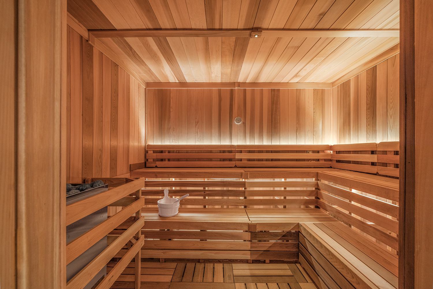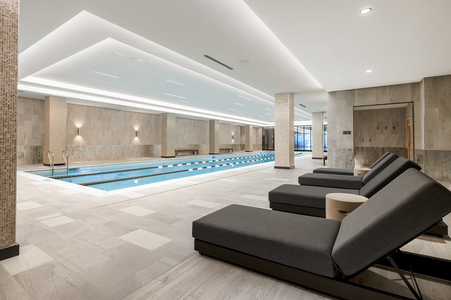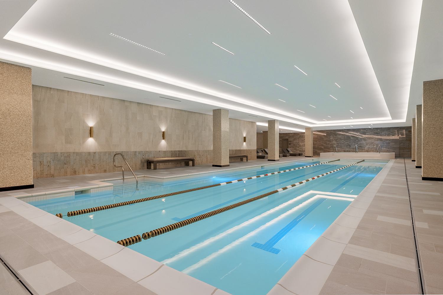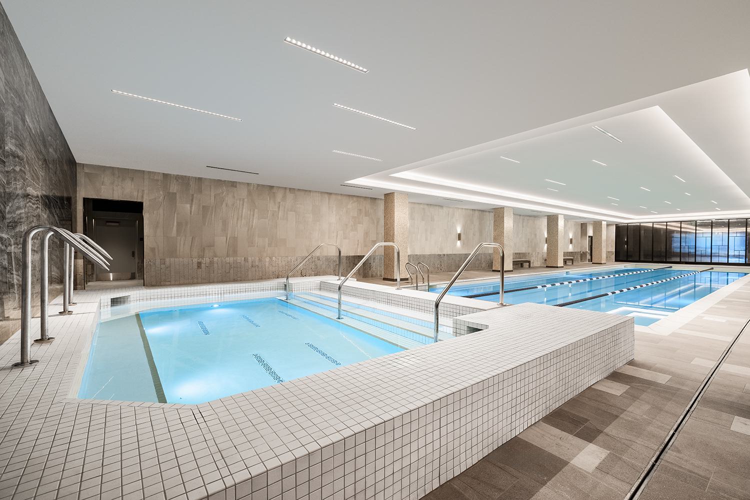 - High-end fitness center with gym, sauna, climbing wall, hot tub, lap pool and yoga/spin studios