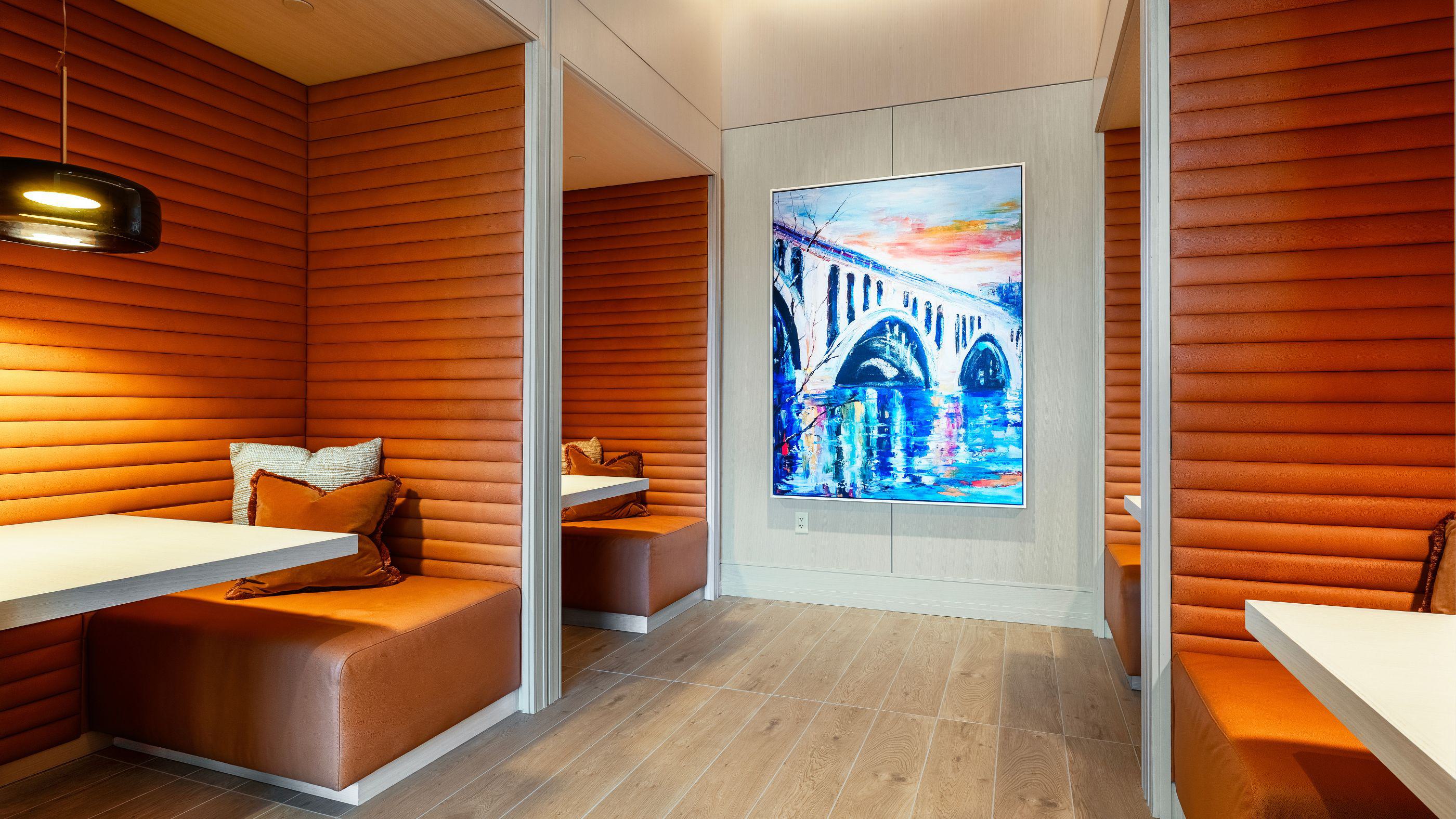 Aerie pairs crisp, light-filled residences with amenity spaces that feel like a boutique hotel. Sculptural pendant lighting, rich wood and terrazzo, jewel-tone upholstery, and teal and brass details deliver a layered, graphic palette with standout moments at every turn.