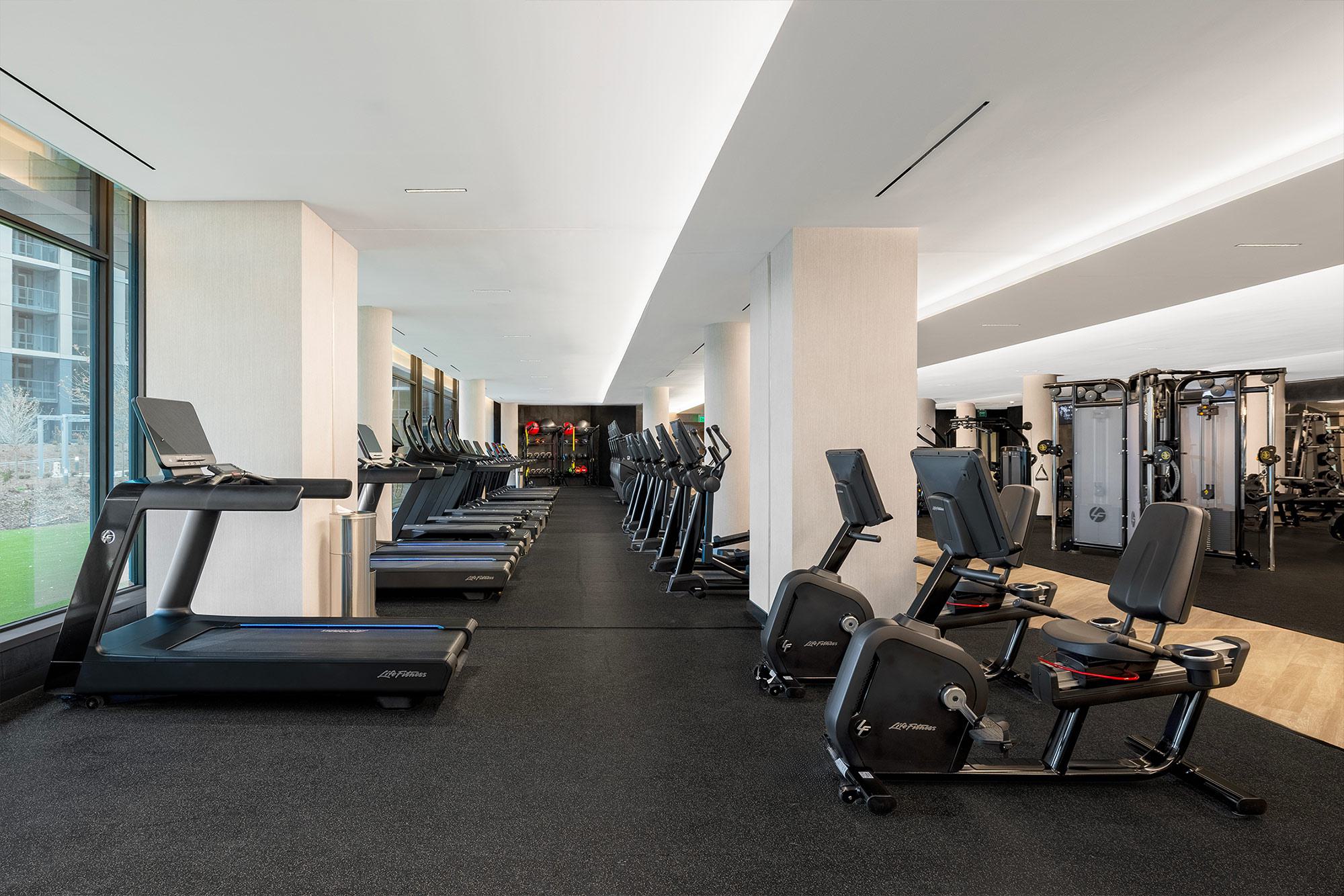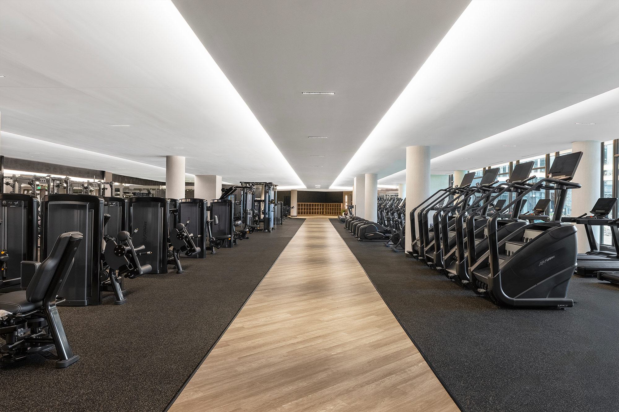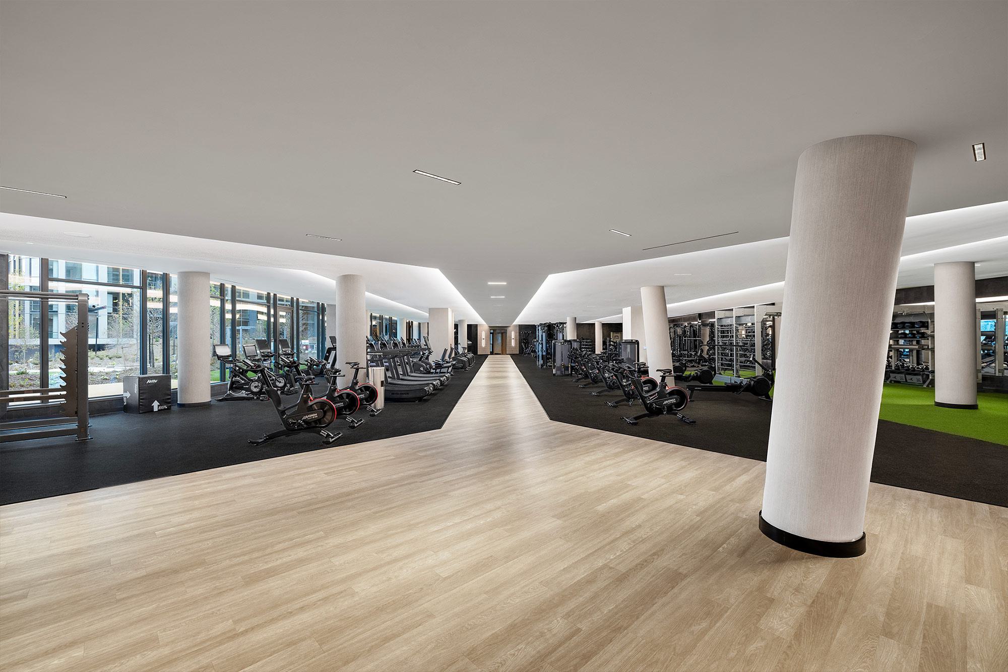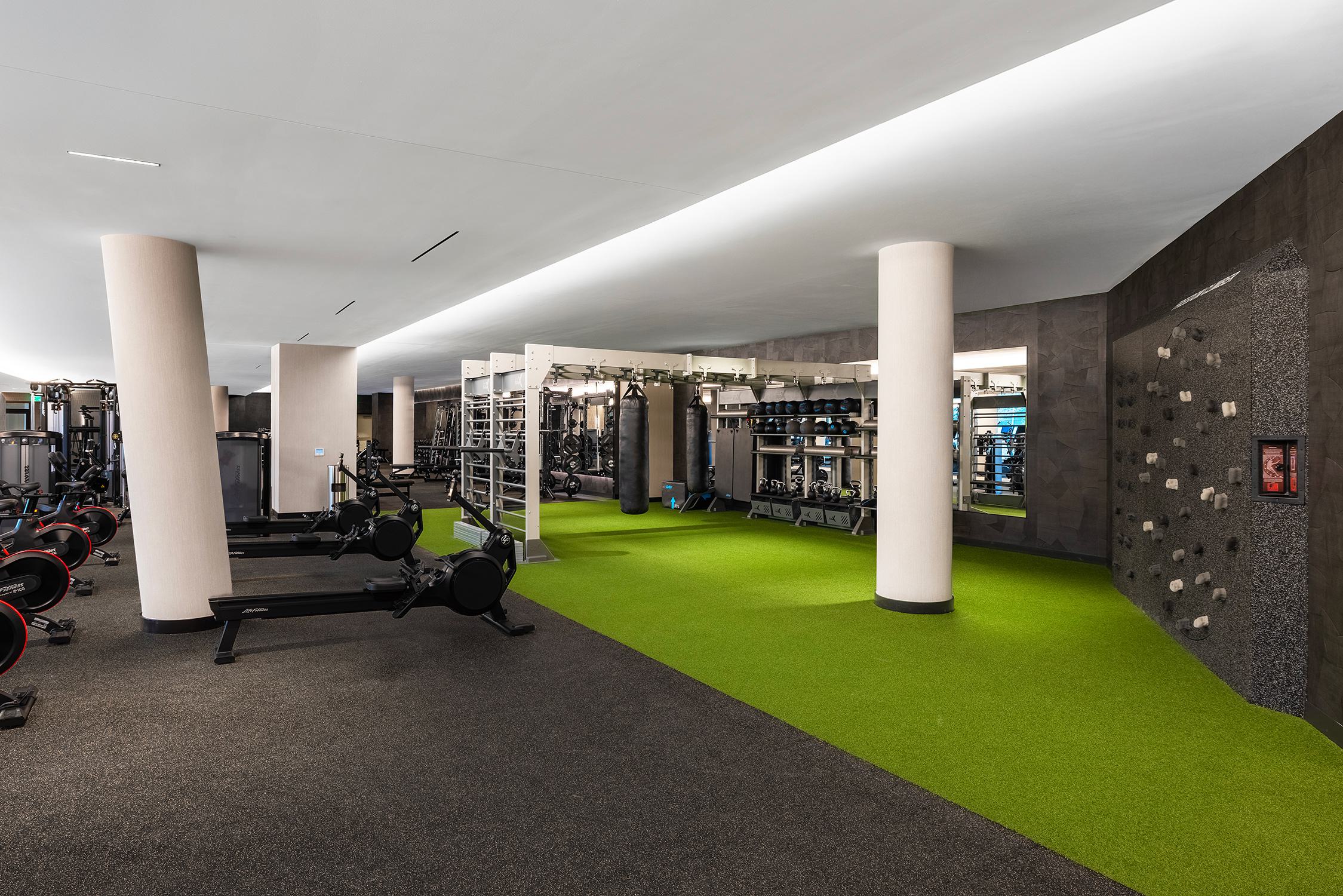 - High-end fitness center with gym, sauna, climbing wall, hot tub, lap pool and yoga/spin studios